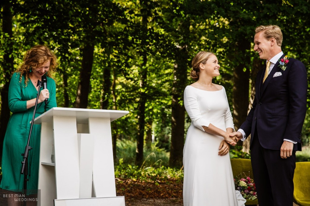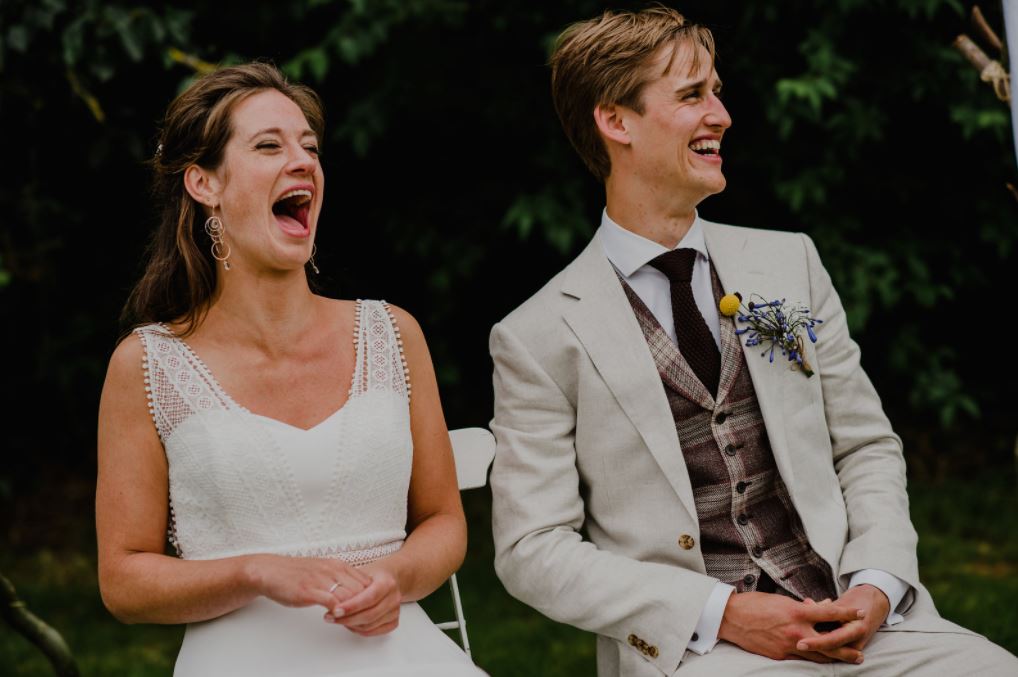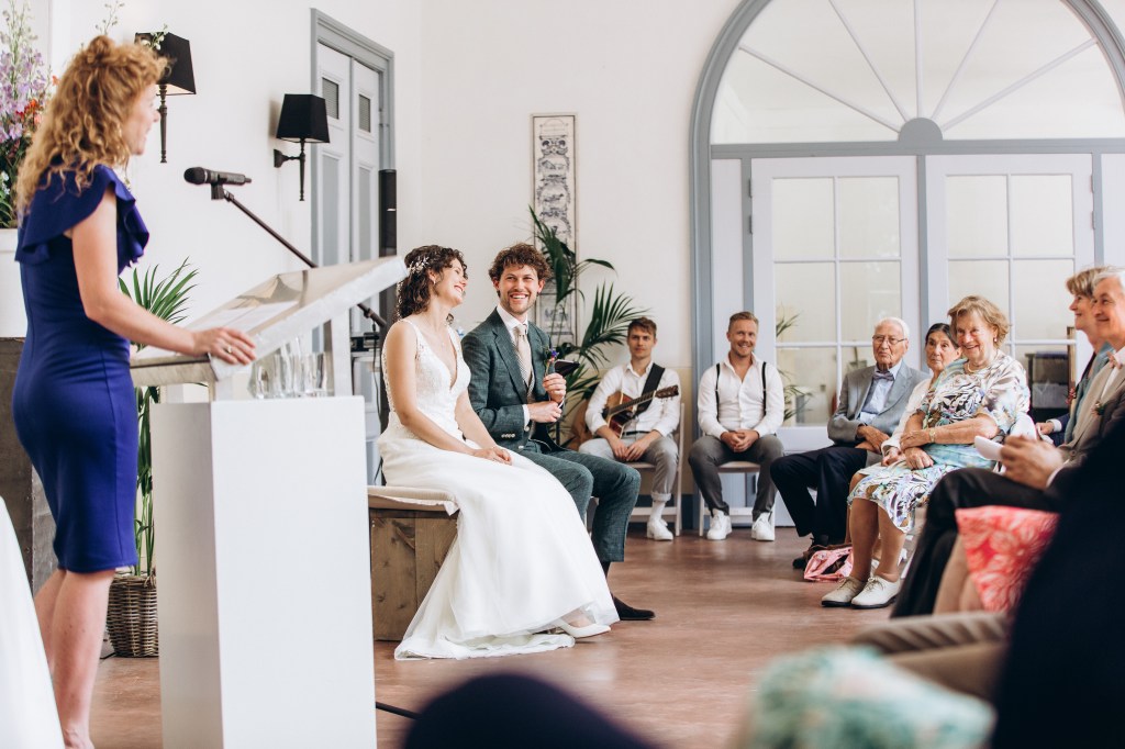“Dat was de reactie van onze gasten op Hilke haar toespraak tijdens onze ceremonie. Wij kunnen niets anders dan dat beamen. Hilke is een virtuoos op het gebied van taal en spreken in het openbaar en wist precies het accent op de juiste plekken te leggen. Wat heeft ze ons als individuen, maar ook onze relatie zo treffend omschreven. Hier en daar een ontspannend grapje tussendoor met veel aandacht voor persoonlijke anekdotes. In de voorbereiding blijkt dat ze veel ervaring heeft en ze laat je nadenken over dingen waar je anders niet aan gedacht zou hebben. Ook haar flexibiliteit was erg prettig, gezien de corona-omstandigheden van onze bruiloft. Wij vonden het fijn haar veel vrijheid te geven in de ceremonie, zodat wij als bruidspaar ook echt verrast werden. En dat werden we volop. Hilke, onmeunig bedankt!”
